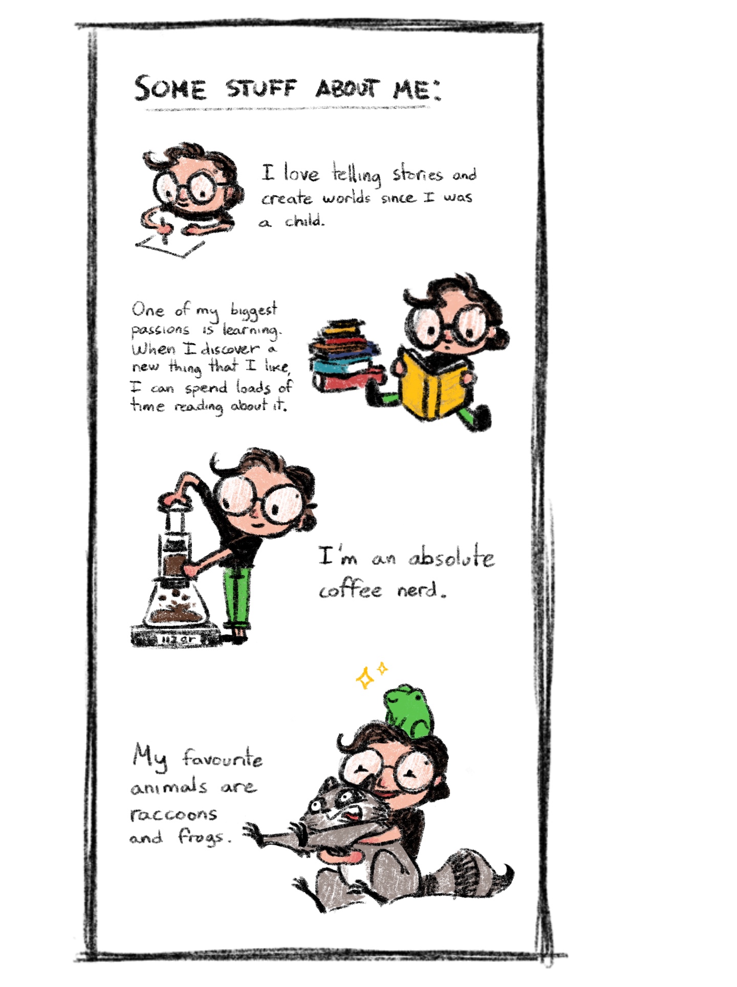 I've studied Fine Arts at the University of Salamanca, character design at U-Tad and more recently I finished the European program of project development for TV at La Poudrière, in France. I've also attended to several VisDev, character design and storytelling workshops. Yeah, a lot of stuff, but that's because I love learning. In fact, I confront every project as a new opportunity of learning things and improve as a storyteller and as an artist.